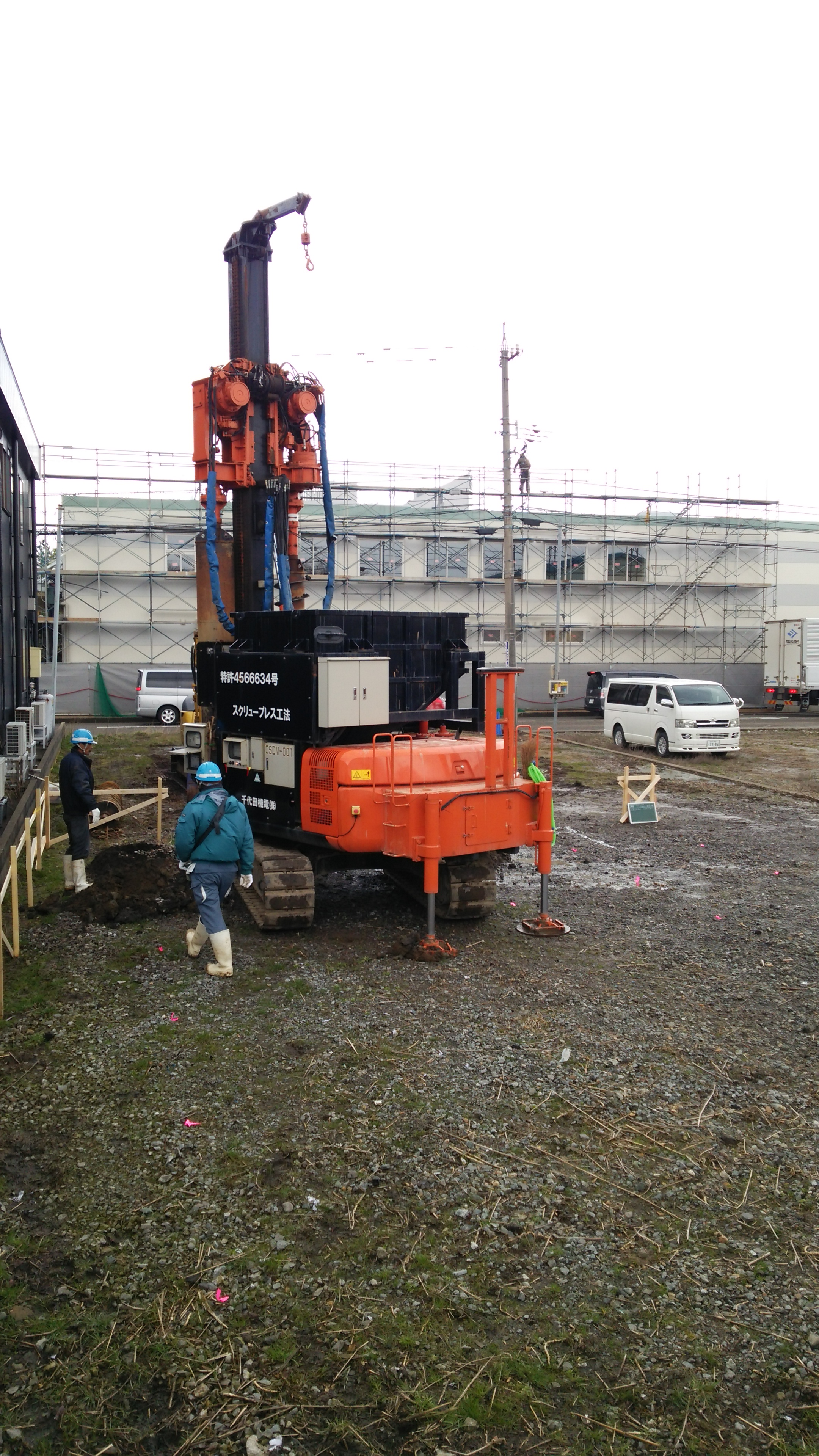 2月初旬に土壌調査《スウェーデンサウンディング試験》を行い、天然砕石パイル打設による土壌改良施工事中。